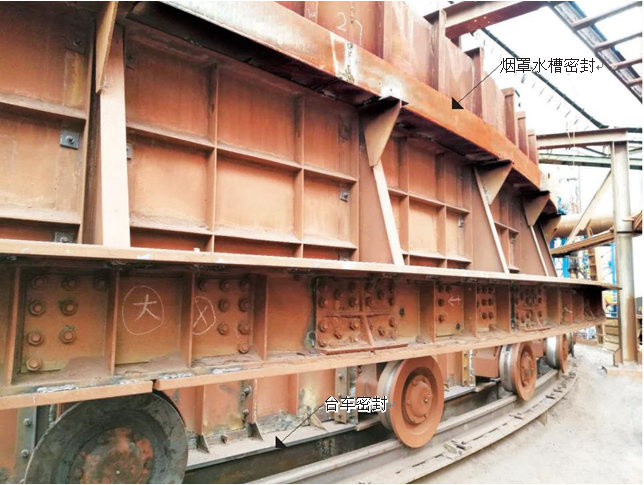 密封采用彈性可自調(diào)結(jié)構(gòu)??筛鶕?jù)環(huán)冷臺(tái)車跑偏情況進(jìn)行彈性調(diào)整。對(duì)環(huán)冷機(jī)底梁、臺(tái)車輪、三角梁、煙罩等位置進(jìn)行有效密封。煙罩部分采用水槽式密封結(jié)構(gòu),保證煙罩圈梁始終在水槽密封內(nèi)運(yùn)行。密封后有效改善現(xiàn)場(chǎng)噴料、漏風(fēng)。改善現(xiàn)場(chǎng)環(huán)境,提高煙氣溫度,從而增加了發(fā)電量。